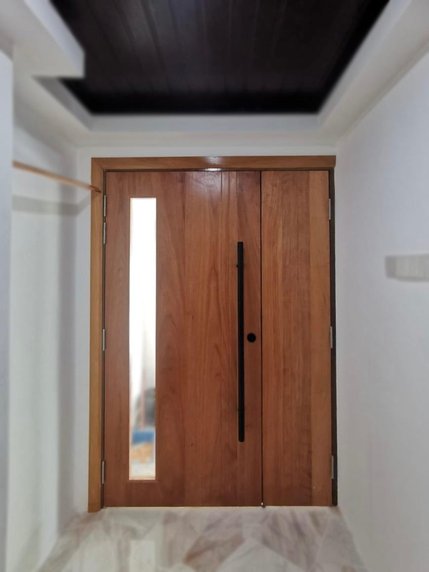 • Huge chengal solid pivot door with side glass.