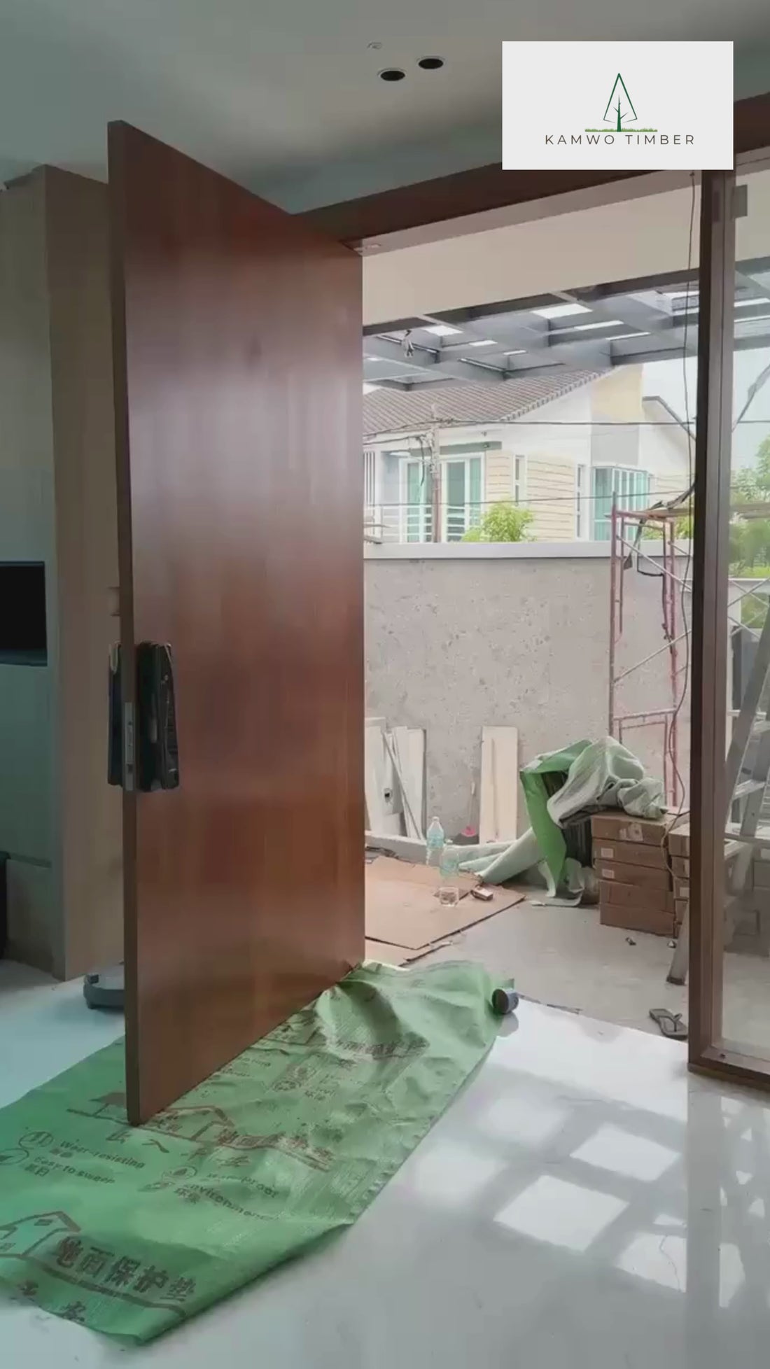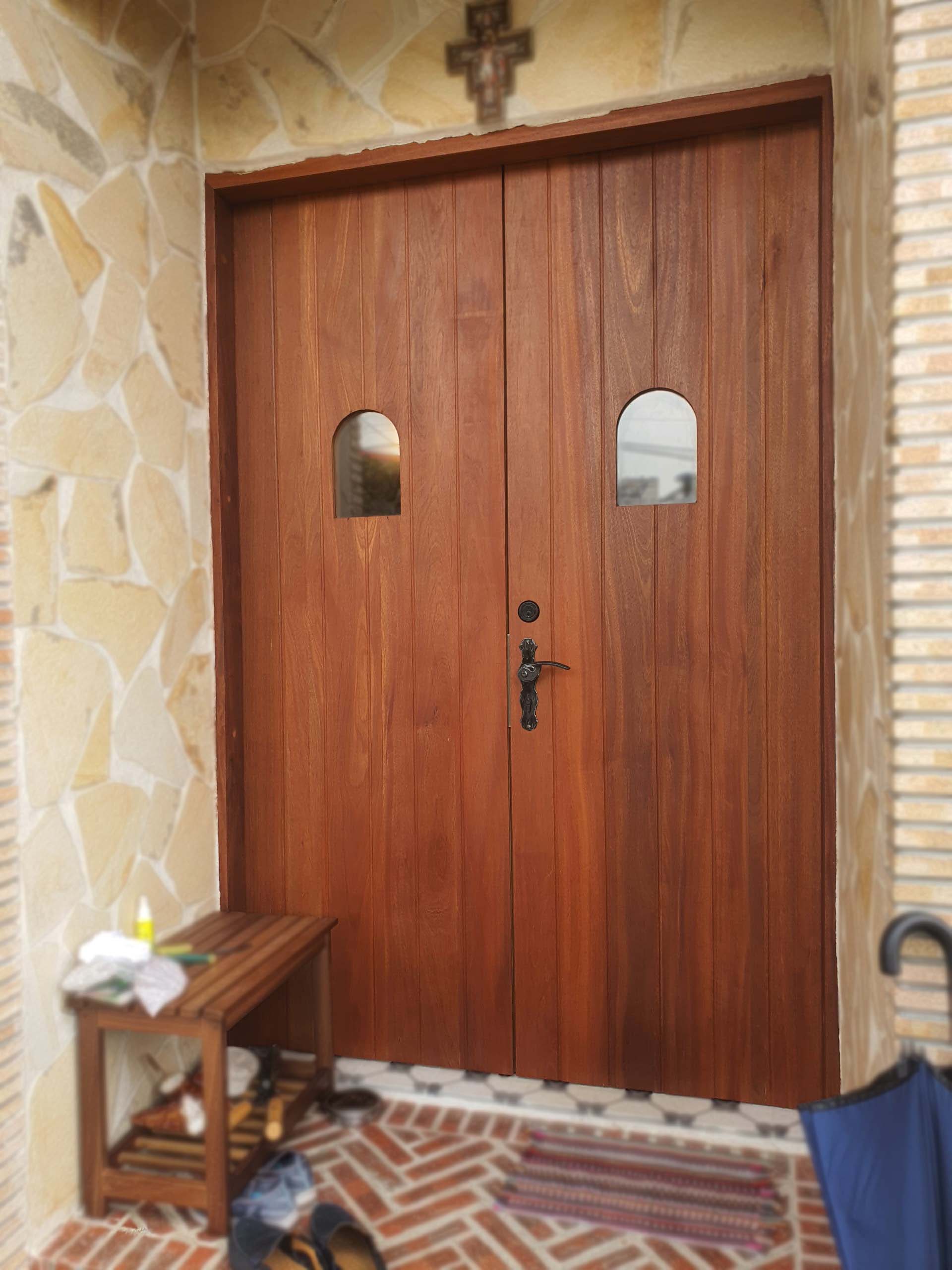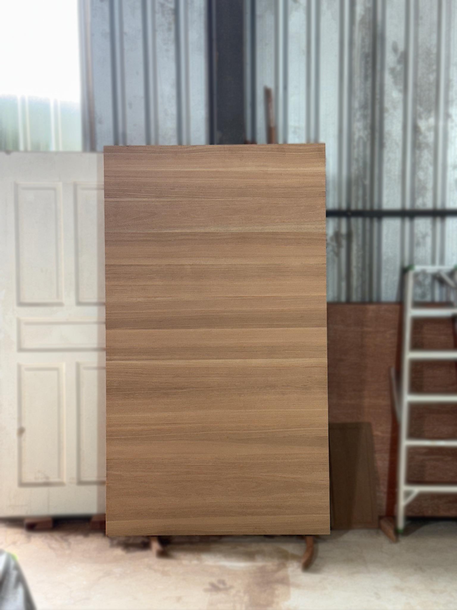 • Full solid grade A yellow balau door with plain design and sanding finished, blurred background.